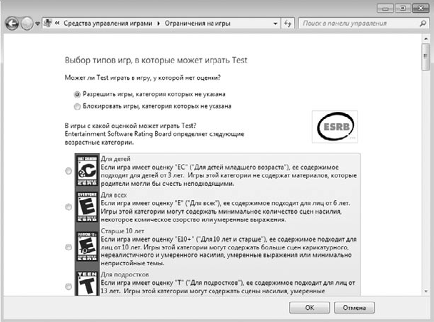 В игры с какой оценкой может играть <имя_учетной_записи>? Механизм родительского контроля в своей работе использует статистические данные негосударственной организации ESRB (Entertainment Software Rating Board), которая занимается определением рейтингов компьютерных видеоигр и других приложений, распространяющихся на территории США и Канады. Организация работает с 1994 года и за это время проанализировала более десяти тысяч приложений, поэтому ее оценкам вполне можно доверять, даже несмотря на территориальные ограничения. На выбор пользователя представляется шесть категорий, ориентированных на определенный возраст пользователя, который может работать за компьютером. Каждая категория определяет критичные ограничения. Итак, согласно ESRB есть следующие категории [1] .