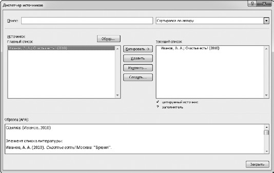 3. После упоминания фамилии Петрова нажимаем кнопку Вставить ссылку и снова выбираем из списка необходимую книгу. Теперь в тексте появляется ссылка (Петров, 2010).