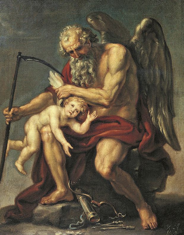 Сатурн с косой, сидящий на камне и обрезающий крылья Амуру. Художник И. Акимов