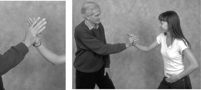 Если вы исполняете активную роль человека, который оказывает давление, для начала прочувствуйте, как сила и мощь поднимаются из центра вашего существа. Затем начинайте медленно надавливать рукой на ладонь вашего визави. Насколько далеко продвинуться вперед и оттеснить руку партнера, решать вам: вы можете продолжать натиск до тех пор, пока сохраняете равновесие и твердо стоите на ногах.