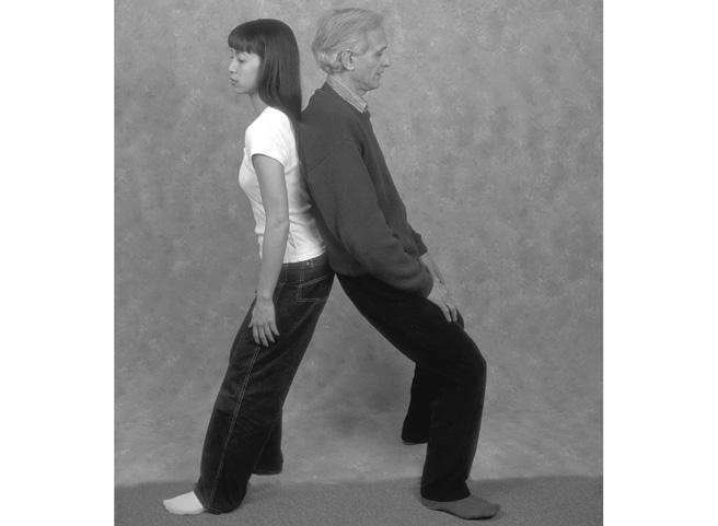 Противостояние «спина к спине». Для этого упражнения вам также нужен надежный партнер. Встаньте на расстоянии одного шага, опершись друг на друга спинами, как показано на рисунке.