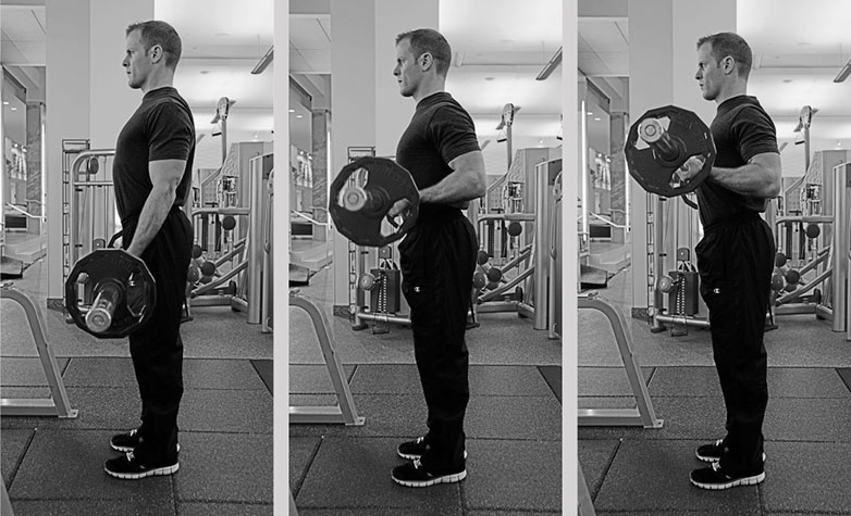 На снимках вверху представлен стандартный хват, ладони обращены вверх. Чтобы сделать рекомендуемый обратный хват, расставьте руки на ширину плеч и возьмитесь за гриф ладонями вниз. Скорость и количество повторов при тягах и сгибаниях – такие же, как в протоколе Оккама, пять секунд вверх и пять секунд вниз.