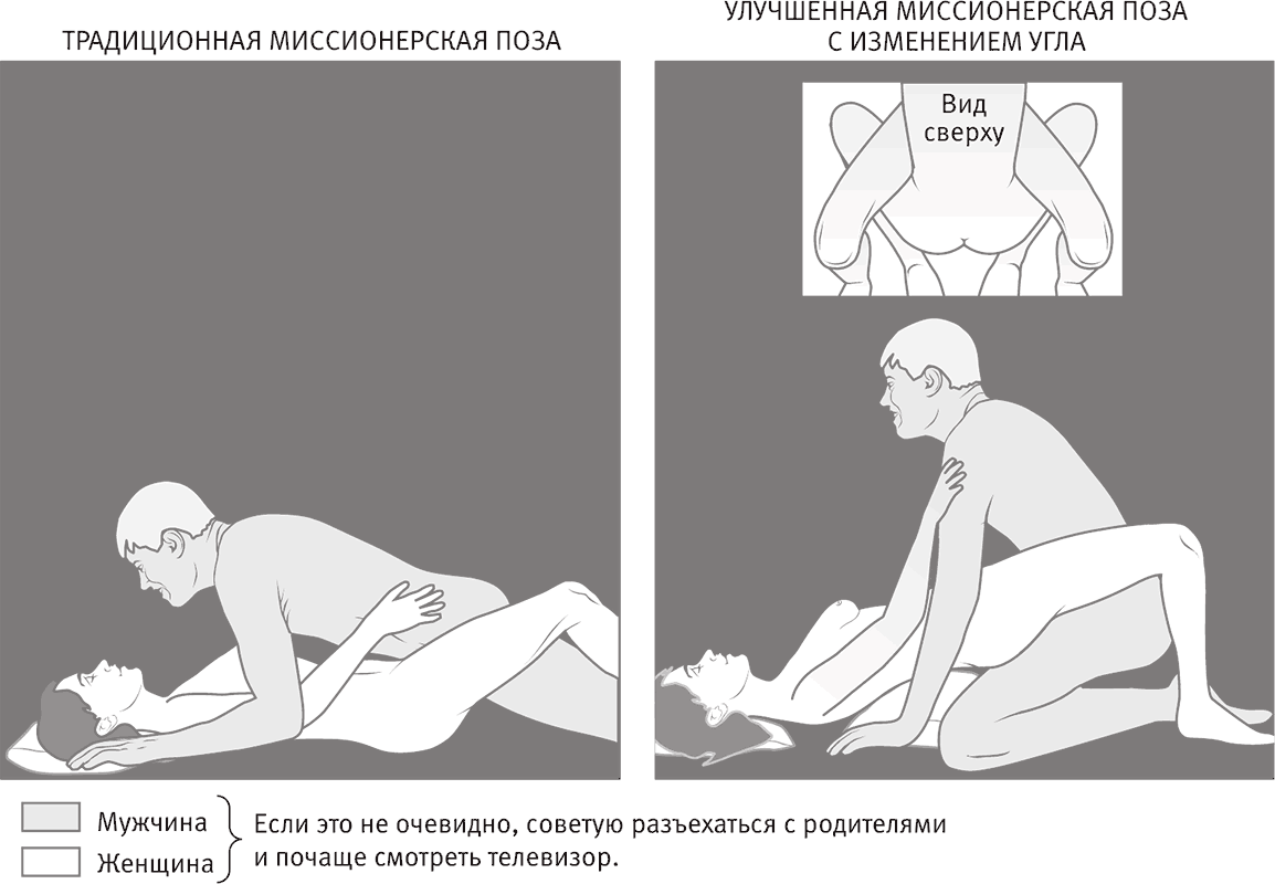 Примечание о глубоких проникновениях для обладателей орудий крупного калибра: если в такой позе ваш пенис достает до шейки матки, что неприятно женщинам, «разверните» одно бедро, как принято говорить в индустрии фильмов только для взрослых. Если принять пупок партнерши за 12 часов, вам нужно направить пенис на десять или на два часа. Этот способ годится для всех поз, в которых возможно глубокое проникновение (коленно-локтевой, с ногами на плечах и т. п.). Боль несексуальна – разве что женщина имеет иное мнение.