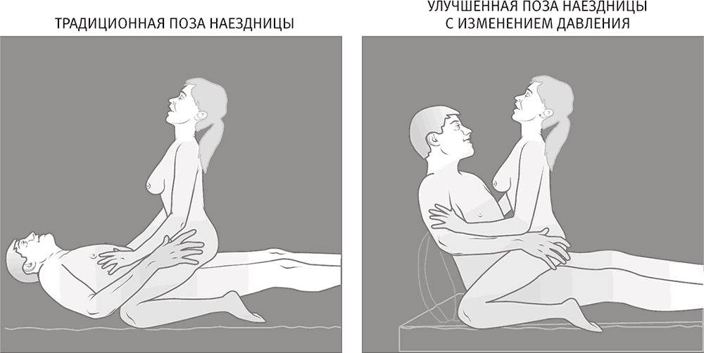 Это настолько меняет угол проникновения, что максимальное трение достигается при соприкосновении лобковой кости мужчины с клитором, а не головки пениса со стенками влагалища. Так одним выстрелом убиваются сразу два зайца: мужчина может заниматься сексом гораздо дольше, а женщина получает прямую стимуляцию клитора.