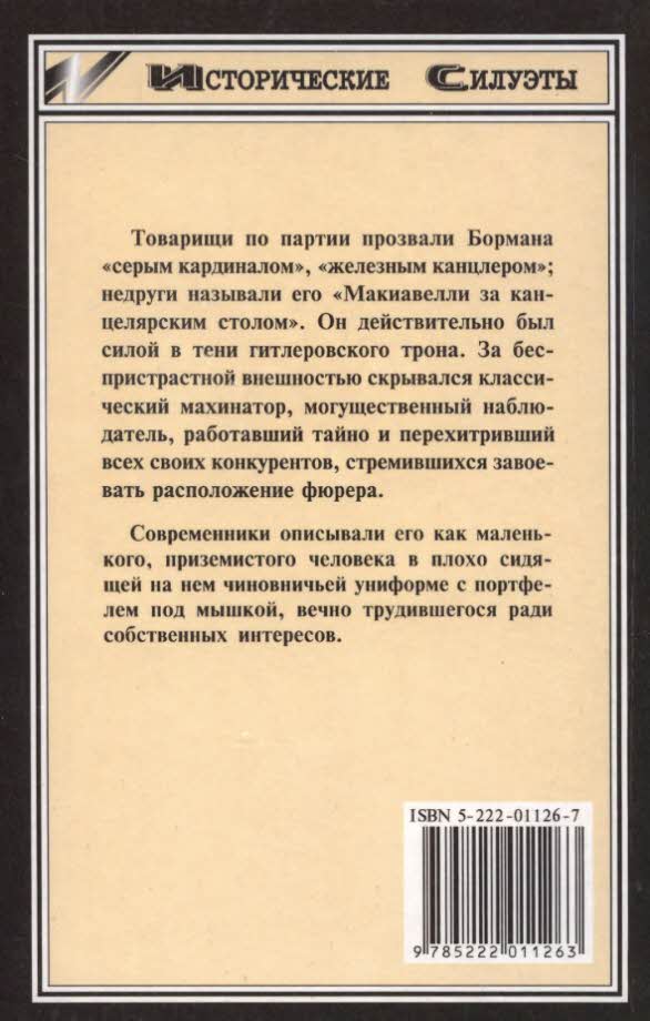 Товарищи по партии прозвали Бормана «серым кардиналом», «железным канцлером»; недруги называли его «Макиавелли за канцелярским столом». Он действительно был силой в тени гитлеровского трона. За беспристрастной внешностью скрывался классический махинатор, могущественный наблюдатель, работавший тайно и перехитривший всех своих конкурентов, стремившихся завоевать расположение фюрера.