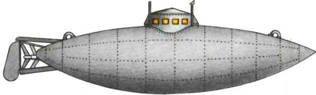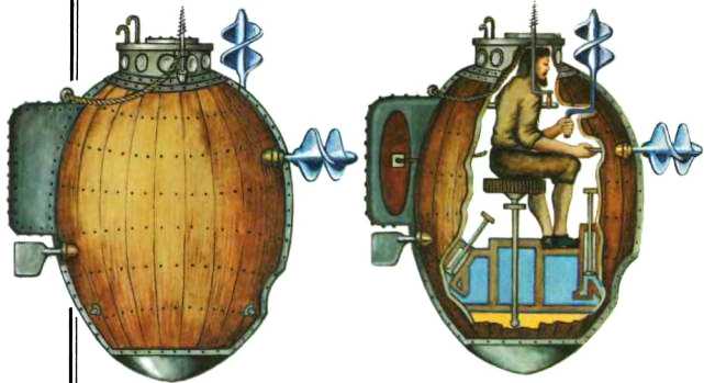 И, наконец, первое судёнышко, а вернее, аппарат для перемещения под водой изобрёл и построил уже в середине прошлого века американец Давид Бушнел. Своё подводное судно он назвал «Черепахой» и сумел несколько раз совершить в нём непродолжительные погружения.