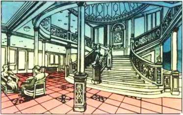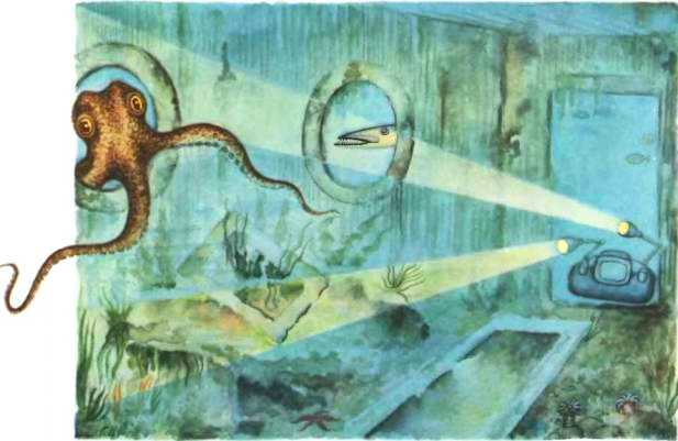 Робот неторопливо выплыл в коридор и, таща за собой тонкий кабель, двинулся туда, где должен быть салон. Дверь оказалась распахнутой настежь. Робот проплыл через неё и оказался в большом зале с колоннами, с опрокинутой и засыпанной коричневой ржавчиной мебелью. Сорванные с мест, лежали картины — золочёные рамы с раскисшими полотнами. Это здесь за несколько часов до гибели судна гремела музыка и весёлые пары скользили в танце.