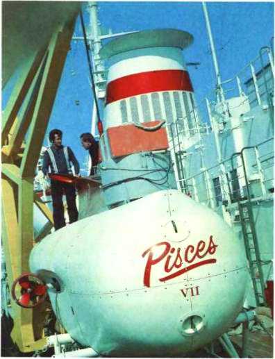 Заурчали электрические моторы, постепенно под аппаратом в тусклом рассеянном свете прожекторов забрезжило покрытое ровным желтоватым илом дно, а затем впереди — как огромная черная гора, поднялось что-то странное, с ровными обрывающимися вниз стенками и плоской, также засыпанной желтоватым илом вершиной. Края этого сооружения терялись во тьме.