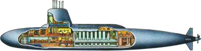 На рисунке такой боевой корабль в разрезе. Его оружие — ракеты. Даже их выпускают, не всплывая.