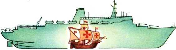 Каравеллы Колумба… Чтобы вы увидели, какими крошечными были по сегодняшним меркам эти суда, художник нарисовал их на фоне силуэта современного пассажирского парохода.