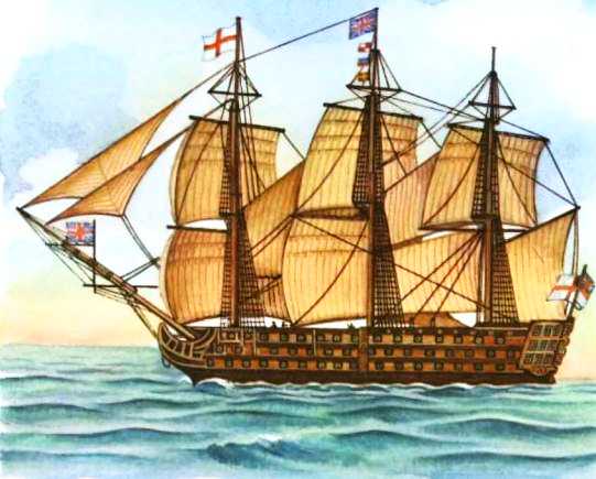 Перенесёмся на три столетия назад и посмотрим, какими стали к этому времени боевые парусные корабли. Никогда — ни прежде, ни потом — не строились они такими большими, не имели столь сильного вооружения и не требовали такого искусства в управлении. Сто пушек в три ряда с каждого борта, три мачты с двумя десятками парусов, ещё одна горизонтальная мачта, выдающаяся впереди носа корабля, — бушприт, сотни канатов и верёвок (для каждой у моряков — своё название), тяжёлые якоря на носу и на корме, которые приходится поднимать вручную! Для всех этих работ и для участия в бою требовалась почти тысяча человек команды!