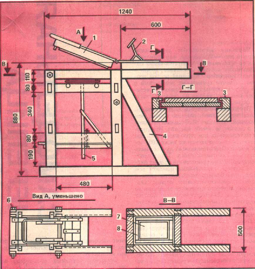 Формовку черепицы производят на станках. Простейший деревянный станок был сконструирован в середине нашего века Г. Морозовым. Его станину (рис. 1) делают из чисто оструганного бруса сечением 80x80 мм. Форму (рис.3) изготовляют из досок толщиной 20 мм и шириной 70 мм. Она представляет собой ящик без дна. Стенки формы обшивают кровельной тонколистовой оцинкованной сталью минимальной толщины (0,35...0,45 мм). Внутренние размеры формы соответствуют размерам матрицы. Нижние края торцовых стенок формы окантовывают стальной полосой шириной 20 мм. Саму форму крепят ушками в центре станины между ножками и боковыми брусьями. Ушки длиной 70...80 мм являются продолжением стальной полосы, окантовывающей торцовые стенки формы. Эти ушки загибают под прямым углом на высоту 20 мм от верхнего обреза торцовых стенок и крепят к горизонтальным брусьям станины шурупами. Вместо шурупов можно применить винты или болты с гайками. Но как ушки, так и головки метизов следует заглубить в дерево брусьев, ибо горизонтальные верхние части последних являются направляющими при перемещении пуансона между ними. Конечно, форма будет намного долговечнее, если сварить ее при помощи газо- или электросварки из стальных листов толщиной 1,5...2,5 мм. В свою очередь, чтобы меньше расшатывать стойки станины, их стягивают самодельными болтами или шпильками диаметром 8, 10 или 12 мм, нарезая соответствующую метрическую резьбу на их концах.