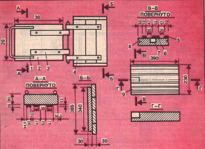 Пуансон изготовляют из древесины твердых пород, предпочтительно из сухого дуба. Плоскости основания пуансона хорошо остругивают рубанком. Наибольшая плоскость станет рабочей, когда на ней будет «возведен» рисунок. В соответствии с выбранным типом черепицы, для примера, к пуансону делают три дубовые планки. Учитывая сложность простановки размеров на сечениях «А-А» и «В-В» (см. рис. 2), приведем эти размеры в тексте. Итак, две планки в одной продольной плоскости имеют ширину 47 мм, а в другой — 35 мм, общая длина каждой планки — 380 мм, высота — 13 мм. Третья планка имеет постоянную ширину 33 мм, длину 380 мм и высоту 15 мм. В ее середине на всю длину плоскости выбирается полуовальная бороздка шириной 12 мм и глубиной 6 мм. Стороны углубления скругляются до половины глубины планки и должны в сечении напоминать равнобедренную трапецию.