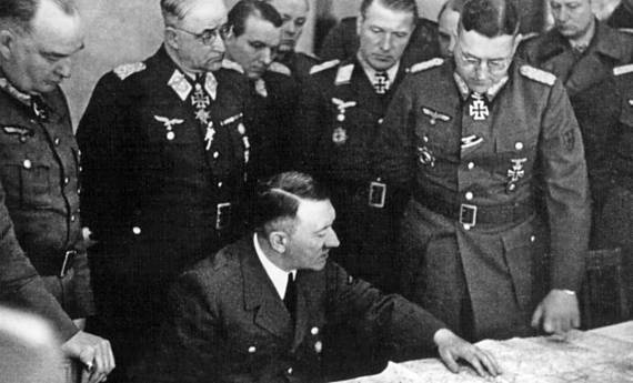 Совещание в штабе 9-й армии 11 марта 1945 г. Над картой склонился командующий армией Бюссе. За спиной Гитлера стоит командующий 6-м воздушным флотом Грейм (в очках). Крайний слева – командир CI корпуса генерал Берлин