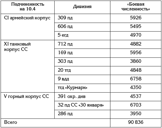 Несмотря на то, что большинство соединений на берлинском направлении были недавно сформированы, их «боевая численность» была доведена до высоких значений (см. таблицу). Даже недавно прошедшая разгром в Восточной Померании 5-я егерская дивизия была доведена до «боевой численности», которой могли бы позавидовать многие пехотные дивизии вермахта в середине войны. Обращаю внимание на высокую «боевую численность» эсэсовской пехотной дивизии и 9-й воздушно-десантной дивизии. Эти не относившиеся к вермахту формирования имели свои штаты и, несмотря на схожесть с организационной структурой армейских формирований, превышали «боевую численность» ПД-44 в 6410 человек. Власовская 600-я пехотная дивизия также превышала по своей «боевой численности» штат соединений вермахта. Хотя ее присутствие в данной таблице скорее формальность. После наступления локального значения 13 апреля 1945 г. начальник штаба 9-й армии полковник Хольц рапортовал ОКХ «В связи с некомпетентностью дивизии во время сегодняшней атаки и поступившими сведениями о недисциплинированности дивизии, предлагается разоружить ее и перевести в другой район». В итоге дивизия РОА была передана в подчинение группы армий «Центр». Несмотря на попытки Шернера отправить власовцев на фронт, командир дивизии Буняченко увел своих людей в Богемию, и в сражении за Берлин соединение не участвовало.