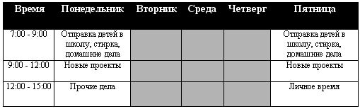 Элли, мать четверых детей, использовала свое рабочее время очень эффективно. У нее был свой план распределения домашнего времени, и она справлялась с планированием более-менее успешно до тех пор, пока не сократила свой рабочий график с полной рабочей недели до трех дней в неделю. У нее появились выходные в понедельник и в пятницу — целых два дня, но она была удивлена тем, что не могла приступить ко всему, что планировала сделать в это неожиданно освободившееся время.