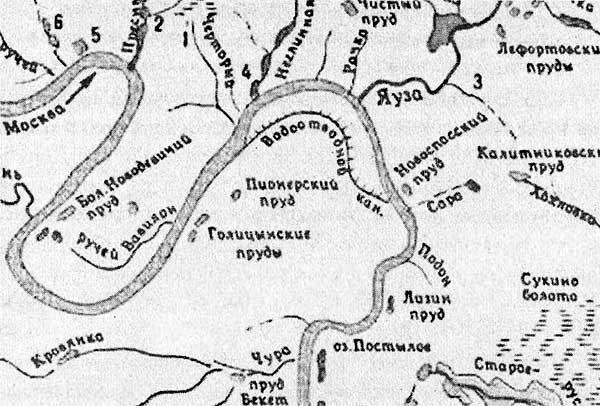 Обратим внимание еще на одну интересную подробность. Летопись сообщает, что спускавшимся с — высокого холма на Куликово поле войскам Мамая БЫЛО ОЧЕНЬ ТЕСНО при входе на поле боя. Настолько тесно, что они какое-то время были вынуждены даже постоять на месте, поскольку «им негде было расступиться», см. выше. Чем такое можно объяснить? На нечаевском «Куликовом поле» — НИЧЕМ. Там нет ни холмов, ни достаточно глубоких рек, ни каких-либо других преград при входе на поле боя. Но если Непрядва — это Яуза, то иначе и быть не могло. Вы только взгляните на Кулишки. Войска Мамая просто не могли не стесниться на небольшом пространстве между Яузой и подножием Красного (Таганского) холма, прежде чем все воины смогли перейти по мостам через Яузу на Кулишки = Куликово поле.