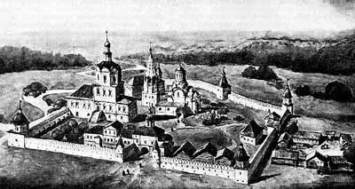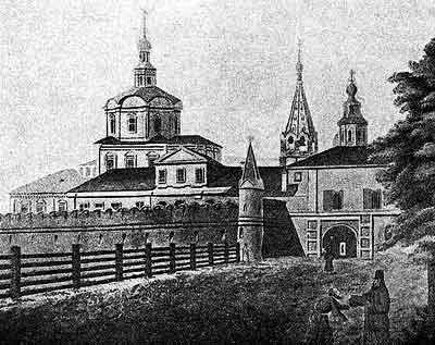 Рис. 84. Общий вид Андроникова монастыря в XVIII веке. Акварель Кампорези. Взято из [5], с.132.