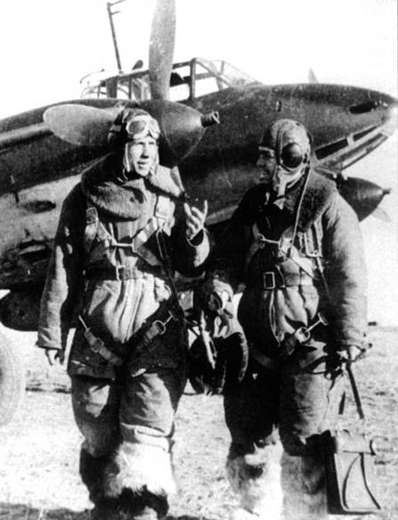 Члены экипажа пикирующего бомбардировщика в зимней летной одежде. На заднем плане – Пе-2 110-й производственной серии. На самолете установлена закрытая турель ВУБ-1 с 12,7-мм пулеметом УБТ. Самолеты 110-й серии стали первыми «пешками», получившими турели ВУБ- 1. Первые Пе-2 110-й серии сошли со сборочной линии завода в июне 1942 г. Хорошо видны выступающие из коков храповики для соединения с автостартером.