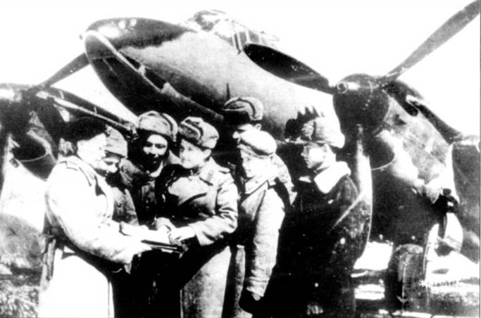 В конце 1942 г. летчицы женского 587-го бомбардировочного авиаполка выполнили первый боевой вылет. Явно пропагандистский снимок сделан на фоне Пе-2 110-й производственной серии. Впоследствии за отличия в боевой работы полк будет преобразован в 125-й гвардейский бомбардировочный.