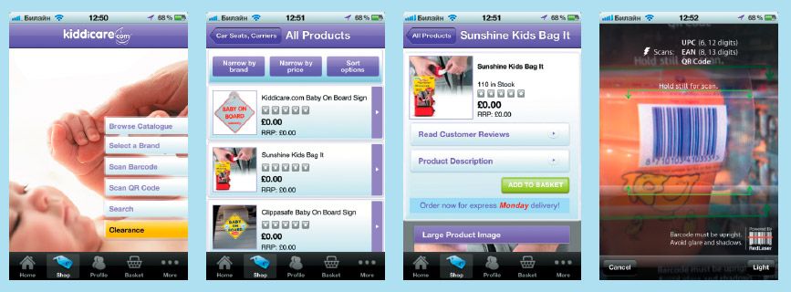 Приложение было разработано для поддержки мультиканальной стратегии и включает в себя безопасную оплату покупок, сканирование штрихкодов на товарах, сравнение цен и поиск. Основная функция мобильного приложения – помогать потребителю при покупках из дома, в том числе в сравнении цен в физических магазинах, включая магазины конкурентов, в которых продаются такие же детские товары, как и на сайте Kiddicare.com (очевидно, что задача Kiddicare – переключить покупателя с конкурентного магазина на покупку на своем сайте).
