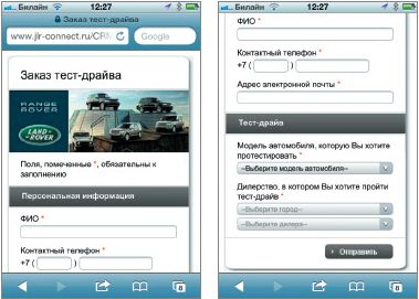 Рис. 10.5. Страница мобильного сайта компании «Jaguar Land Rover Россия», на которой пользователь может заказать тест-драйв
