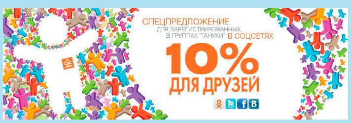 Сеть ресторанов «Тануки» последовательно работает с социальными сетями, предлагая своим клиентам скидки на меню и возможность 10 %-й скидки на все меню доставки друзьям в социальных сетях.