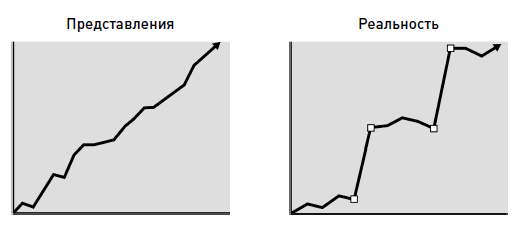 Рост стартапа обычно нельзя назвать медленным и стабильным. Чаще всего необычные и неожиданные возможности – прорывы, контракты, открытия – ведут компанию вперед и позволяют ей расти. Хороший пример – Groupon. В первый год своего существования компания еле дышала, и вы, вероятно, никогда не слышали ее предыдущего названия – The Point. Это она помогала объединиться людям, которые хотели привлечь единомышленников к участию в тех или иных социальных и гражданских проектах. Эндрю Мэйсон, владелец сайта, заметил, что пользователи активнее всего объединяются друг с другом, когда хотят увеличить свою покупательную способность. Мэйсон увидел в этом возможность войти в новую нишу, поэтому совершил вираж к новому плану и создал сайт (всего за пару недель), предлагавший пользователям групповые скидки. Эндрю стал действовать быстро и эффективно, дав тем самым новый импульс развитию компании, и The Point превратилась в Groupon, сегодня ставшую акционерным обществом, капитализация которого составляет несколько миллиардов долларов. Но ни один стартап не способен расти такими астрономическими темпами вечно – по крайней мере без новых возможностей, позволяющих совершить новый прорыв. Сегодня у Groupon появилась масса конкурентов. Эндрю и члены его команды ищут новые возможности. Одна из них – скидки в местных компаниях, которые можно получать в режиме реального времени. Этот проект, Groupon Now, позволяет розничным компаниям, продающим скоропортящийся товар (например, ресторанам), привлекать посетителей в непопулярные часы. Если проект окажется удачным, компания совершит следующий скачок в развитии. Иначе говоря, траектория Groupon похожа на кривую реальности, изображенную на рисунке.