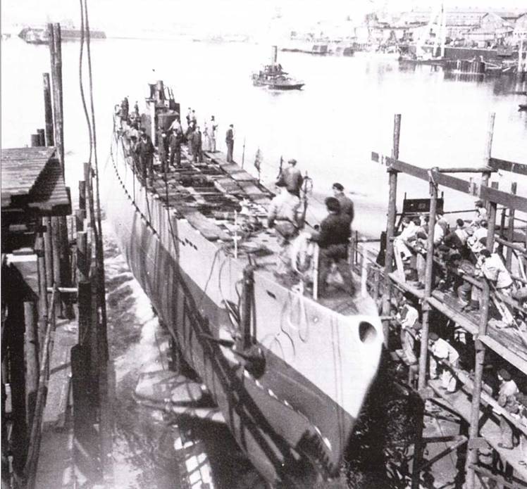 Здесь запечатлены два момента из жизни подводных лодок, которые были характерны для 47 подлодок серий IXС и IXС/40. Все они были потоплены уже в нервом боевом походе. На снимке вверху – спуск со стапеля подлодки U 175 в 5-м эллинге верфи «Везер» в Бремене 2 сентября 1941 г. Эта новая большая верфь в годы войны выпустила наряду со многими эсминцами и подлодками других типов 60 подлодок серий IXС и IXС/40. На заднем плане виден недостроенный тяжелый крейсер «Зейдлиц» и крейсеры Z 30 и Z 32.