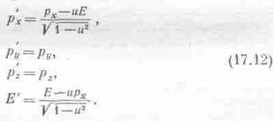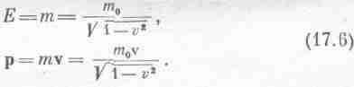 Теперь мы спросим: существуют ли величины, которые преобразуются при переходе от неподвижной системы к движущейся так же, как и х, у, z, t? Наш опыт обращения с векторами подсказывает, что три из этих величин, подобно х, у, z, могли бы представлять собой три компоненты обычного пространственного вектора, а четвертая могла бы оказаться похожей на обычный скаляр относительно пространственных вращений: она бы не изменялась, пока мы не перейдем в движущуюся систему координат. Возможно ли, однако, связать с одним из известных «тривекторов» некоторый четвертый объект (который можно назвать «временной компонентой») таким образом, чтобы вся четверка «вращалась» точно так же, как изменяются пространство и время в пространстве-времени? Мы сейчас покажем, что действительно существует по крайней мере одна такая четверка (на самом деле далеко не одна): три компоненты импульса и энергия в качестве временной компоненты преобразуются вместе и образуют так называемый «четырехвектор». Доказывая это, мы избавимся от с тем же приемом, какой употреблялся в уравнении (17.4). Например, энергия и масса отличаются только множителем с2и при надлежащем выборе единиц измерения энергия совпадет с массой. Вместо того чтобы писать Е=тс2, мы положим Е=т. Если понадобится, в окончательных уравнениях можно опять расставить с в нужных степенях.