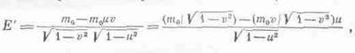 Теперь подсчитаем, какой окажется энергия Е' по измерениям космонавта. Он, конечно, воспользуется той же массой покоя, но зато скорость станет v'. Он возведет v' в квадрат, вычтет из единицы, извлечет квадратный корень и найдет обратную величину