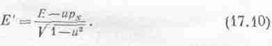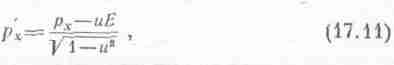Как же будут выглядеть импульс и энергия в новой системе координат? Чтобы узнать это, надо преобразовать уравнения (17.6). Это преобразование легко получить, зная, как преобразуется скорость. Пусть некоторое тело имело скорость v, а мы наблюдаем за ним из космического корабля, который сам имеет скорость u, и обозначаем соответствующие величины штрихами. Для простоты сперва мы рассмотрим случай, когда скорость v направлена по скорости и. (Более общий случай мы рассмотрим позже.) Чему равна скорость тела v' по измерениям из космического корабля? Эта скорость равна «разности» между v и u. По прежде полученному нами закону