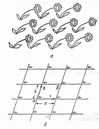 Геометрические характеристики этого рисунка обоев, учитывающие только его свойства повторяемости и не касающиеся геометрии самого цветка или его художественных достоинств, показаны на фиг. 30.1,б. Если вы возьмете за отправную какую-то точку, то сможете найти соответствующую точку, сдвигаясь на расстояние а в направлении, указанном стрелкой 1. Вы можете попасть в соответствующую точку, также сдвинувшись на расстояние b в направлении, указанном другой стрелкой. Конечно, имеется еще много других направлений. Так, вы можете из точки a отправиться в точку b и достигнуть соответствующего положения, но такой шаг можно рассматривать как комбинацию шага в направлении 1 вслед за шагом в направлении 2. Одно из основных свойств ячейки состоит в том, что ее можно описывать двумя кратчайшими шагами к соседним эквивалентным расположениям. Под «эквивалентными» расположениями мы подразумеваем такие, что в каком бы из них вы ни находились, поглядев вокруг себя, вы увидите точно то же самое, что и в любом другом положении. Это фундаментальное свойство кристаллов. Единственное различие в том, что кристалл имеет трехмерное, а не двумерное расположение и, естественно, каждый элемент решетки представляет не цветы, а какие-то образования из атомов, например шести атомов водорода и двух атомов углерода, регулярно повторяющихся. Порядок расположения атомов в кристалле можно исследовать экспериментально с помощью дифракции рентгеновских лучей. Мы кратко упоминали об этом методе раньше и не будем добавлять здесь к сказанному чего-либо, а отметим лишь, что точное расположение атомов в пространстве установлено для большинства простых кристаллов, а также для многих довольно сложных кристаллов.