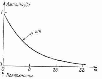 где d — это то расстояние, на котором амплитуда волны уменьшается в е=2,72 раза, т. е. приблизительно в 3 раза. Амплитуда такой волны, как функция от z, показана на фиг. 32.3.