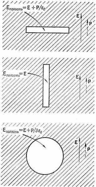 Еполость=Едиэл+P/e0 (дискообразная полость). С другой стороны, используя равенство нулю ротора, мы нашли, что электрическое поле внутри и вне иглообразной полости одно и то же: