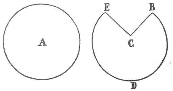 Вытащили сыр и кулебяку. Мы принялись за кулебяку с необыкновенным рвением. Они имела вид весьма странный: круглая как солнце — я никогда в жизни не видывал такой кулебяки — двенадцать вершков [182] в поперечнике — и запах ее разлился по всей сосновой роще, как скоро ее разрезали. Резать ее по общепринятым правилам было очень неудобно, но мы нашли средство: в самое короткое время выели в ней угол в 45 градусов. Она явилась на стол правильным кругом, но через несколько минут вид ее совершенно изменился — что можно видеть из следующего чертежа.