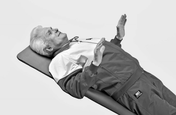 • Исходное положение: лежа на спине, руки согнуты в локтях и полностью подняты на уровне груди навстречу друг другу. Кисти рук слегка (ни в коем случае не сильно) сжаты в кулаки, кулаки почти соприкасаются друг с другом.