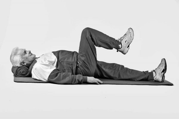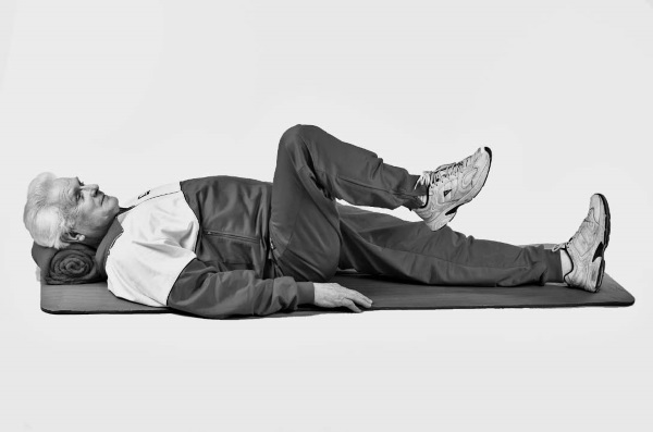 • Затем на пассивном выдохе, не сгибая в колене, опустить ногу.
