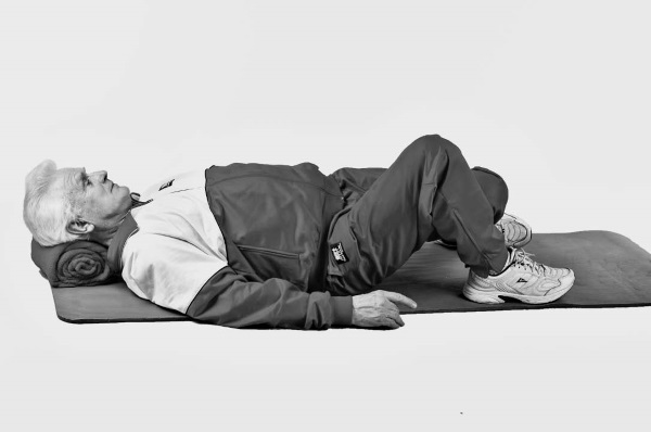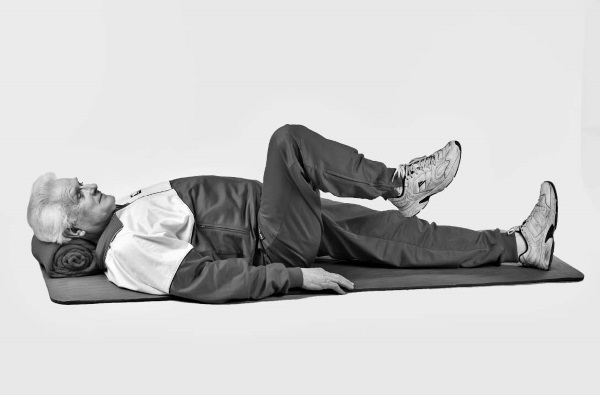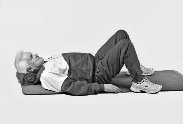 • Исходное положение: лежа на спине, ноги согнуты в коленях, руки расположены вдоль туловища или под головой (кому как удобно).