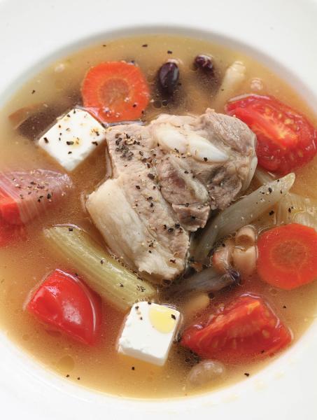 Затем добавить 3 л воды, посолить и поперчить, варить на слабом огне до готовности фасоли в течение примерно 1 часа. За 5 минут до окончания приготовления супа добавить разрезанные пополам помидоры и кусочки сыра фета.