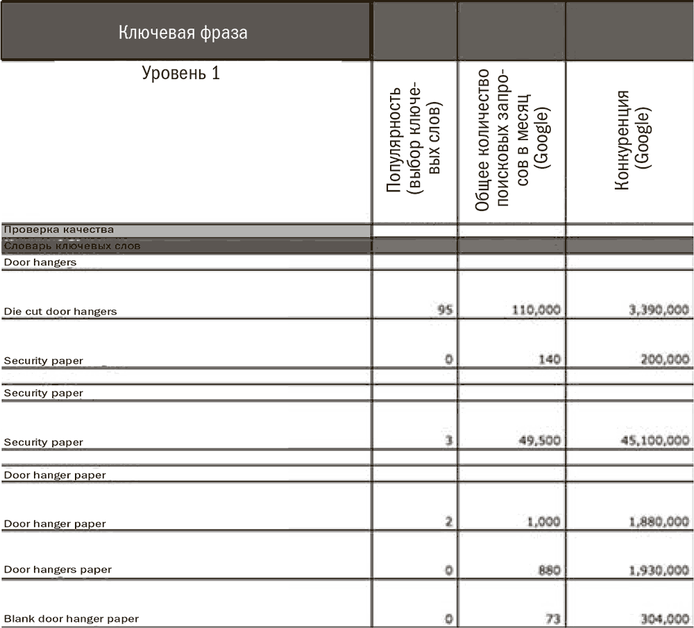 Значения основных показателей ключевых слов желательно определить и изучить при проведении конкурентного анализа еще до начала мозгового штурма, а затем еще раз в ходе рассмотрения списка ключевых слов, полученного при мозговом штурме. В результате получается такая таблица (см. рис. 7.2):