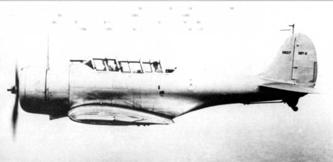 SBD-1 (2-МВ-1, BuNo-1597) в полете с выпущенными посадочными щитками и подвешенной под фюзеляжем 500-фунтовой (227-кг) авиабомбой. Самолет командира эскадрильи VMB-2 с авиабазы Норт-Айленд. Самолет несет маркировку первого звена – глянцевые красные (FS11136) полосу вокруг фюзеляжа и капот