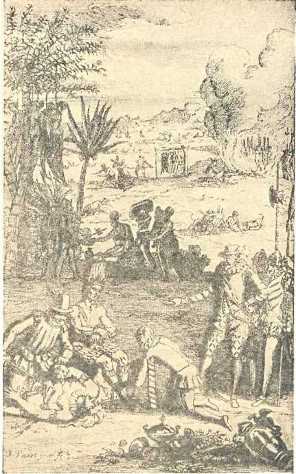Гравюра XVI века, изображающая расправу испанцев над туземцами Эспаньолы
