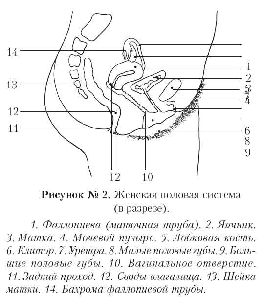 Женская половая система. Наружные половые органы женщины (совокупно называются – вульвой) представлены большими и малыми половыми губами, бартолиновыми железами и клитором, а также, до поры до времени, вход во влагалище прикрыт девственной плевой. Внутренние половые органы женщины состоят из влагалища (по-латыни – «вагина»), которая через шейку матки соединяется с маткой, от матки отходят фаллопиевы (или маточные) трубы, которые соединяются с яичниками (смотри рисунок № 2).
