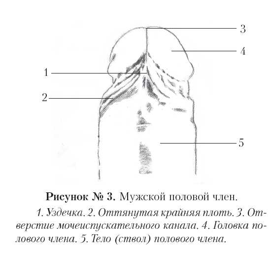 При наружном осмотре пенис состоит из ствола полового члена и его головки [1] (пожалуйста, не путайте с головой, впрочем, это у кого как…), а также крайней плоти и уздечки (крайняя плоть крепится по краю головки, к ее венчику, а внизу образует уздечку – смотри рисунок № 3). Головка и, в особенности, уздечка полового члена – самые чувствительные его части.