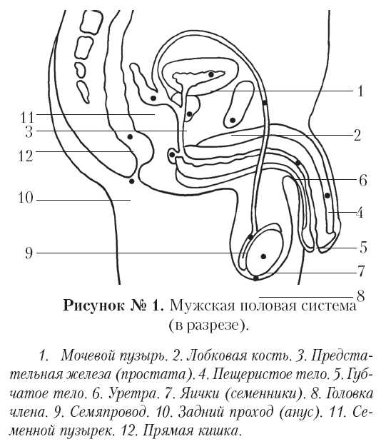 Мужская половая система. Главные действующие лица: мужской половой член (по-латыни – «пенис») и два яичка (не путать с «яйцами»! – яйца у куриц и необразованных идиотов), расположенных в мошонке, а также предстательная железа (по-латыни —«простата»), семенные пузырьки, семяпроводы и уретра. Первые относятся к «наружным половым органам», вторые – ко «внутренним половым органам» (граждане лопухи, смотрите рисунок № 1).