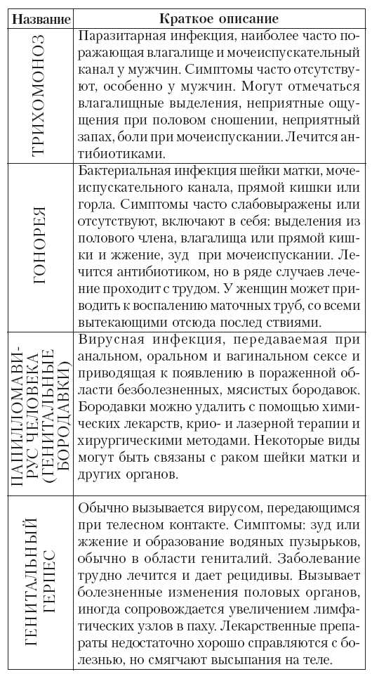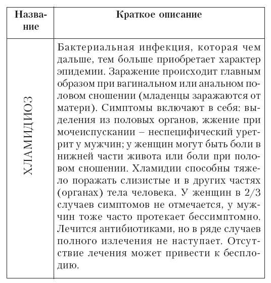 Возбудителей заболеваний, передающихся половым путем, великое множество – хламидии, гонококки, трихомонады, стрептококки, стафилококки, эшерихии, грибы и т. д., и т. п. Мужчины, заразившиеся венерической болезнью, как правило, ограничиваются уретритом, простатитом и эпидидимитом (воспаление придатка яичка). Можно считать, что они легко отделались! В случае же представительниц женского пола, одно только перечисление возможных болезней наводит ужас – вагинит, вульвит, вульвовагинит, цервицит, уретрит, цистит, эндоцервицит, барто-линит, эндометрит, сальпингоофорит, пельвио-перитонит и т. п.