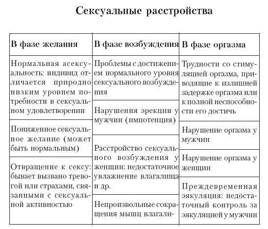 Сексуальные расстройства подстерегают нас на каждой фазе сексуального цикла, чтобы убедиться в этом, достаточно заглянуть в следующую таблицу.