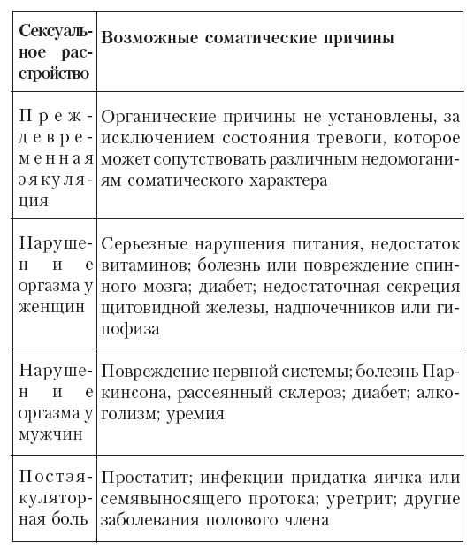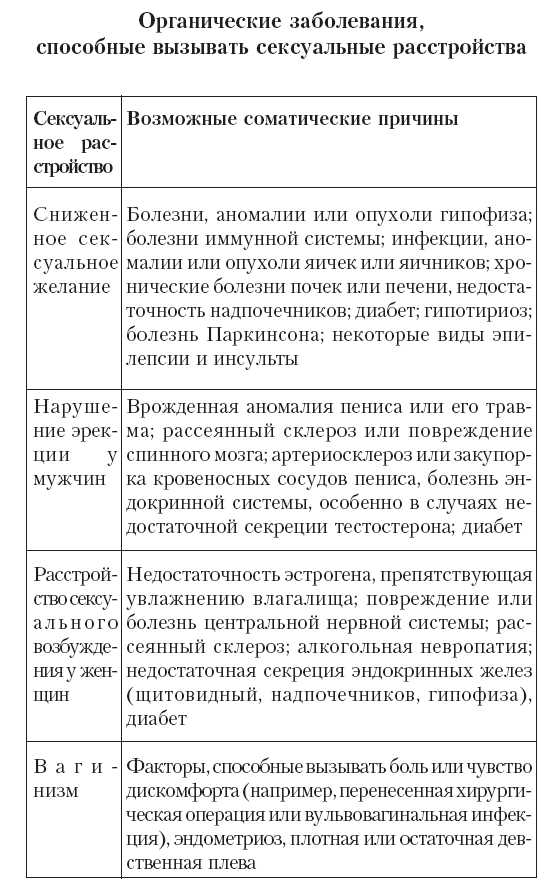 Нам хочется думать, что психологически мы – кремень, а потому, если у нас и случилась какая-то оказия в сексуальных делах, то виной тому – наш организм, а вовсе не мы сами, т. е. не наши чувства. В действительности, физических причин сексуальных расстройств – раз, два и обчелся. Причем, большая часть этих причин характерны для глубокой старости, а вовсе не для молодого, по определению здорового организма. В нижеследующей таблице представлены заболевания, которые могут вызывать сексуальные дисфункции. Найти подобные недомогания у молодого человека затруднительно до невозможности.