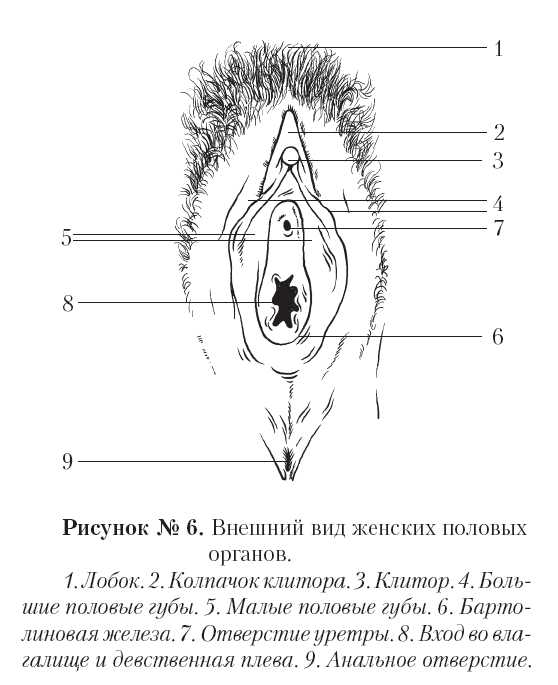 Сразу под клитором, по направлению от лобка, располагается отверстие мочеиспускательного канала. Еще дальше еще одно отверстие – это вход во влагалище. И уже за задним устьем больших половых губ – анальное отверстие. Вот и вся видимая композиция, показанная на рисунке № 6. Необходимо добавить, что у женщин, которые не имели еще половых актов, вход во влагалище бывает закрыт, наподобие своеобразной крышки, «девственной плевой» – тонкой, как правило, полоской соединительной ткани, испещренной небольшими отверстиями. Слово «бывает» – не случайно. У некоторых женщин девственная плева может отсутствовать с самого рождения. У некоторых она удаляется в процессе медицинских манипуляций. У некоторых размеры отверстий в девственной плеве так велики, что ее разрыв во время первого полового акта проходит незамеченным.
